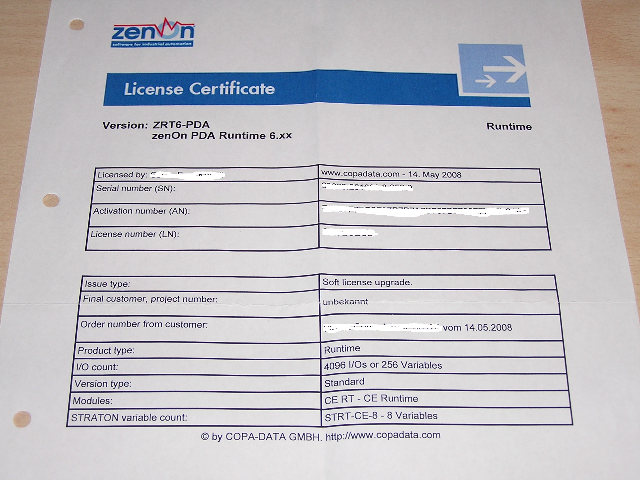 Unused, software license with original certificate. License number masked for obvious reasons. Intended for a project, but was never used
