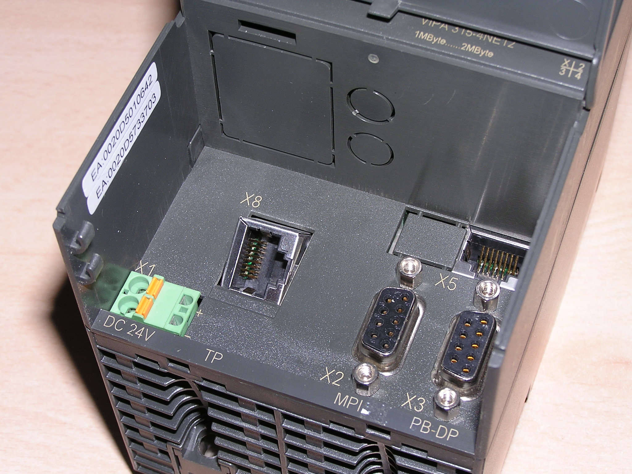 DC 24V, 1MByte, expandable up to 2MByte work memory, MP²I interface, MMC slot, real-time clock, Ethernet interface for PG/OP communication, Profibus-DP master, 12MBaud, up to 125 slaves, additional integrated Ethernet-CP 343 with RFC1006, TCP/IP and S7 communication for 8 connections